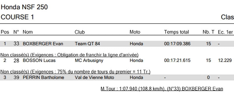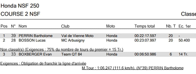 PERRIN remporte donc la catégorie NSF 250 devant Lucas BOSSON (Honda), 9ème au scratch.