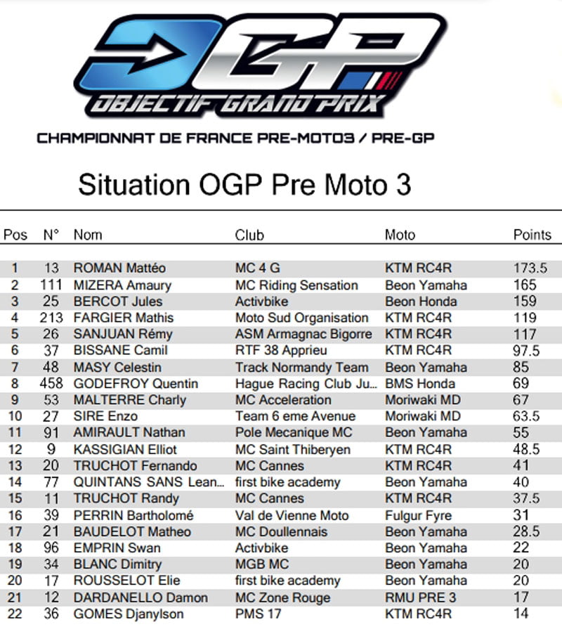 À l’arrivée, MIZERA conclut un week-end couronné de deux victoires. Sur la 2ème marche du podium, le public retrouve SANJUAN qui fait les freins dans l’ultime virage à ROMAN, 3ème. Dans les derniers tours, PERRIN s’octroie la 4ème place devant BERCOT, 5ème.
