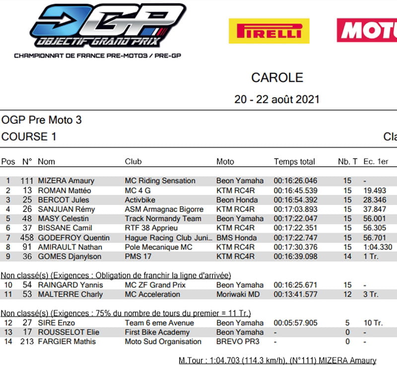 Au fil de la course, RAINGARD et MIZERA restent au coude à coude et se disputent la tête pendant que le peloton s’étiole… De son côté, Mattéo ROMAN pointe toujours au 3ème rang plus de 5 secondes devant Jules BERCOT (Beon Honda), 4ème.