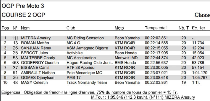 À 5 tours de l’arrivée, RAINGARD chute dans le virage Delta. Sa machine restant couchée sur la piste, la direction de course déploie le drapeau rouge et met fin à la course. MIZERA s’impose donc devant ROMAN et BERCOT qui saisit l’opportunité de monter sur la boite. Discret tout au long des 15 tours, Rémy SANJUAN (KTM RC4R) termine au pied du podium.