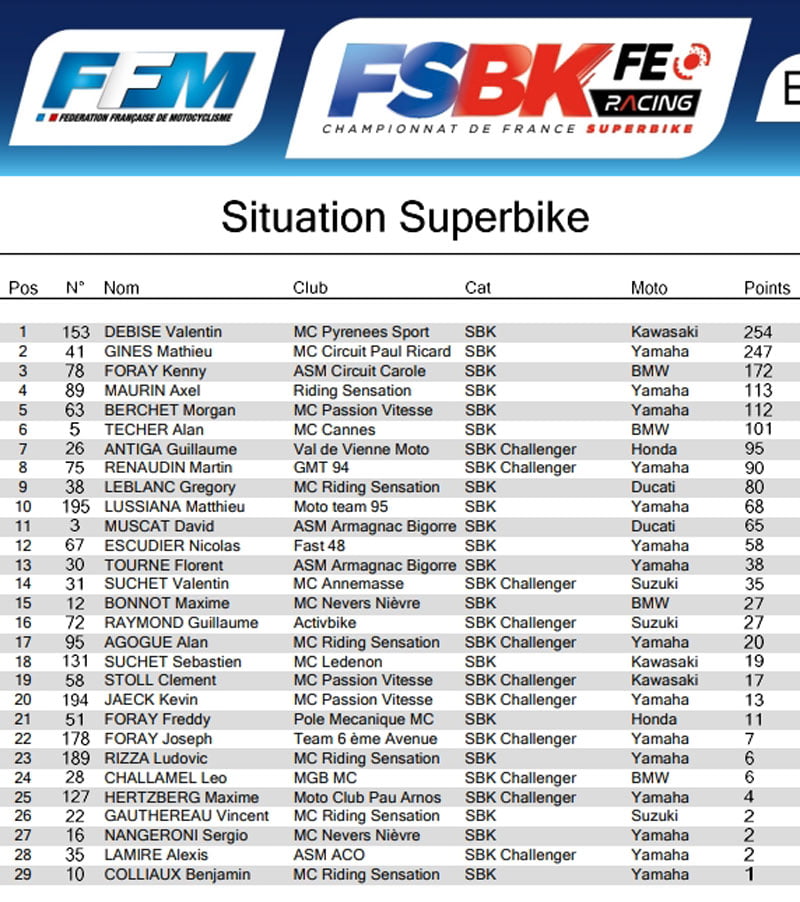 Au classement provisoire DEBISE reste leader avec 254 points devant GINES qui recolle avec 247 points et FORAY, 172 points.