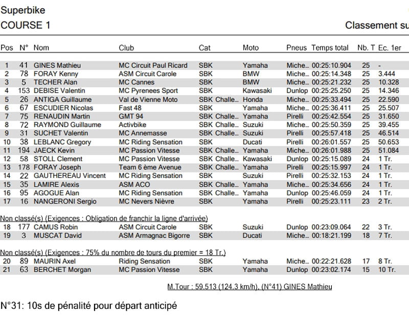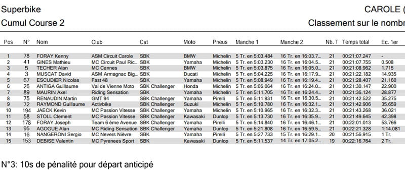 La hiérarchie ne bouge pas jusque dans les derniers tours où FORAY hausse le rythme et prend le meilleur sur GINES. Le classement reste inchangé sur la ligne d’arrivée, le pilote de la BMW n°78 décroche la victoire devant GINES. TECHER confirme la 3ème place devant MUSCAT et ESCUDIER.