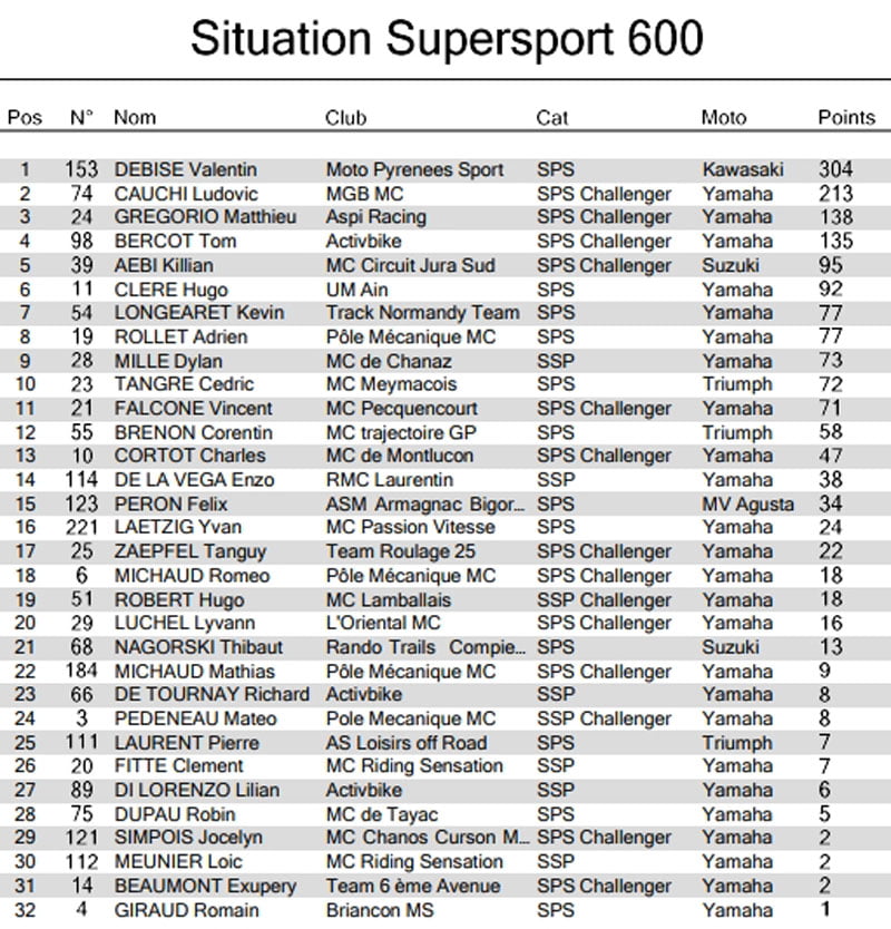 Avec 304 points DEBISE remporte le Championnat de France Supersport 600 grâce à une avance suffisante sur CAUCHI, également assuré de rester second avec 213 points. GREGORIO complète provisoirement le podium avec 138 points.