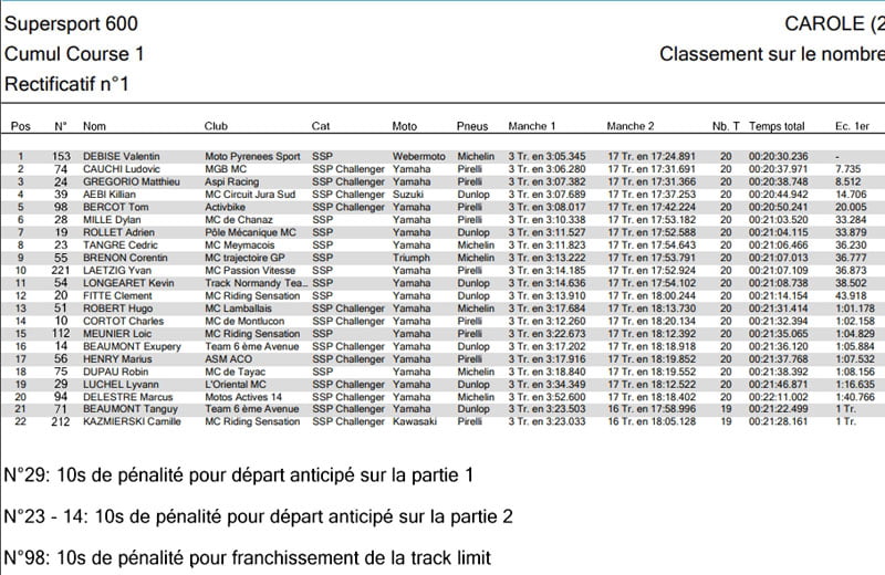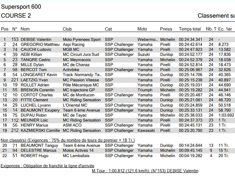 Finalement, DEBISE s’impose aisément au cumul des deux parties de course et, sous réserve de machine conforme, s’adjuge le titre de Champion de France Supersport 600 : c’est le premier titré de la saison 2021 ! CAUCHI profite de son bon début de course pour s’octroyer la 2ème place devant GREGORIO qui complète le podium. AEBI profite des 10 secondes de pénalités de BERCOT pour avoir dépassé les limites de la piste et se classe 4ème. Le pilote de la Yamaha n° 98 termine donc 5ème.