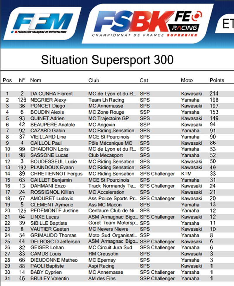 DA CUNHA reste provisoirement leader en Supersport 300 avec 214 points devant ses concurrents directs NEGRIER (198 points) et PONCET (197 points).