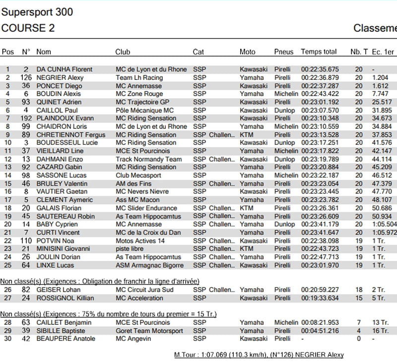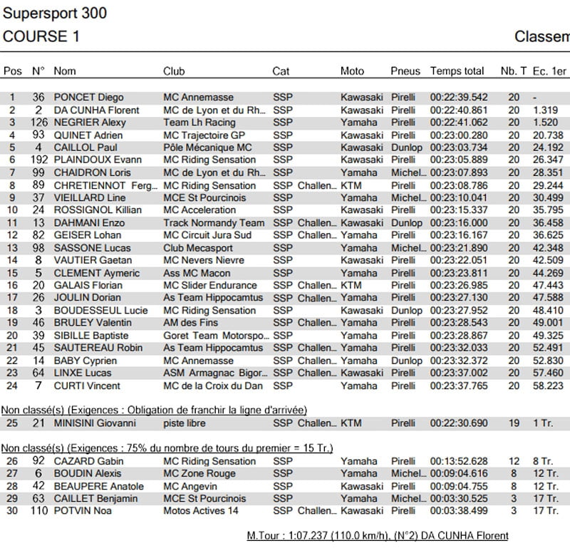 Dans les derniers tours, PONCET confirme et s’offre la victoire avec plus d’une seconde d’avance sur DA CUNHA qui a résisté à l’ultime attaque de NEGRIER, 3ème. Adrien QUINET, quant à lui, maintient sa position et se classe 4ème devant Paul CAILLOL (Kawasaki – Dunlop) et Evann PLAINDOUX (Kawasaki – Pirelli).