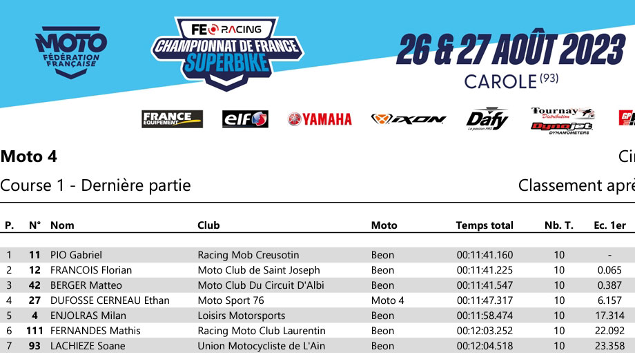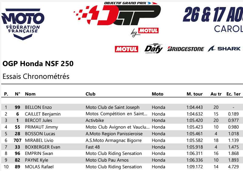 Finalement, dans une ultime tentative, BELLON reprend l’avantage en 1’04’’443 et s’élancera de la pole position. Benjamin CAILLET se contente donc de la 2ème place en 1’04’’632 et devance le Champion de France en titre Jules BERCOT (Honda – Bridgestone), 3ème en 1’05’’420. À noter, le leader du classement provisoire, Evan BOXBERGER (Honda – Bridgestone), n’est que 7ème à près d’une seconde et demie du poleman et devra s’employer en course pour tenter de décrocher le titre dès ce week-end.