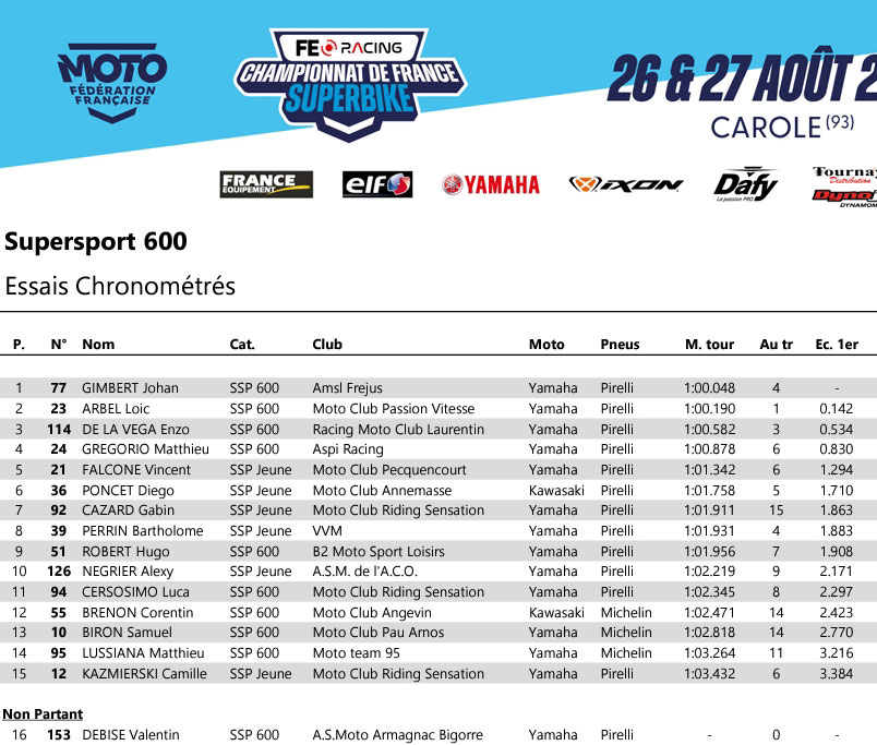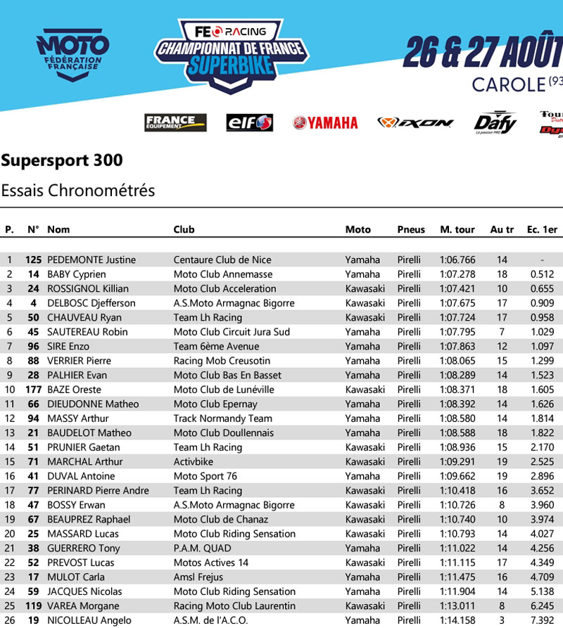 Enzo DE LA VEGA (Yamaha – Pirelli) et Matthieu GREGORIO (Yamaha – Pirelli) sont les plus rapides à se mettre dans le rythme et se placent aux deux premiers rangs dès leurs premiers tours. Le jeune Vincent FALCONE (Yamaha – Pirelli) est également dans le rythme et occupe provisoirement la 3ème position. À noter, victime d’une casse moteur pendant la séance libre 3, l’invité de marque Valentin DEBISE n’est pas en mesure de défendre ses chances.