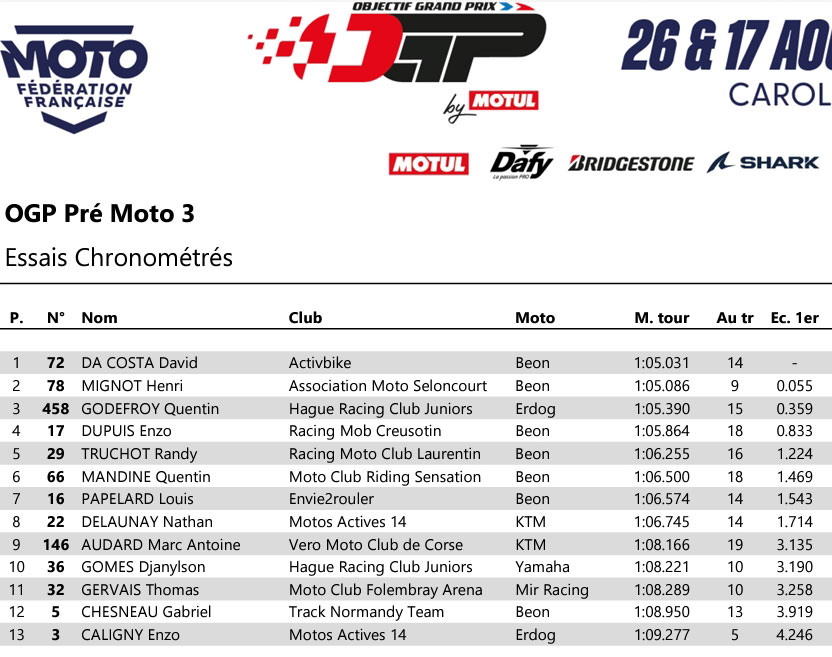 Tour après tour, les trois garçons améliorent progressivement et pour DA COSTA la 14ème tentative sera la bonne. Le pilote de la Beon #72 signe un beau 1’05”031 qui, malgré la persistance de MIGNOT, lui permet de décrocher la pole position. MIGNOT est donc 2ème en 1’05’’086 et GODEFROY, complète la ligne de front en 1’05”390. Entre les trois leaders du Championnat, la lutte s’annonce intense tant les écarts sont faibles entre les chronos.
