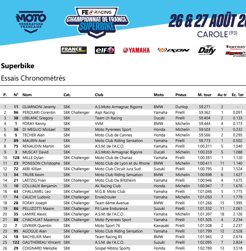 Les conditions de piste sont optimales au moment où les pilotes de la catégorie reine s’élancent, le premier à s’illustrer se nomme Jérémy GUARNONI (BMW MDS – Dunlop). Unique pilote du plateau à être chaussé de pneumatiques Dunlop, le toulousain signe un chrono impressionnant de 59’’271 dès son deuxième tour lancé, nouveau record de la piste en Championnat de France Superbike. Pour Corentin PEROLARI (Yamaha – Pirelli) le début de séance est également fructueux, le pilote de la Yamaha #96 est en 59’’362 dès sa première tentative. Grégory LEBLANC (Ducati TWR – Pirelli) fait lui aussi bonne figure avec le 3ème temps provisoire : 59’’404. Alors qu’il avait été dominateur pendant les essais libres, Kenny FORAY (BMW Tecmas – Michelin) ne semble pas en mesure de se rapprocher du temps de référence à l’instar de son rival DI MEGLIO, assez discret depuis le début du week-end.