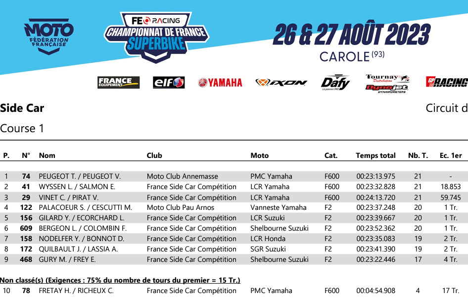 Depuis la pole position, PEUGEOT / PEUGEOT (F600) prend un parfait envol et creuse l’écart avec WYSSEN / SALMON (F600) dès la fin du 1er tour. 3ème, VINET / PIRAT (F600) ne parvient pas à suivre le rythme de ses prédécesseurs et se retrouve déjà relégué à plus de 13 secondes. En embuscade derrière le side #29, on retrouve les F2 de PALACOEUR / CESCUTTI (F2) et GILARD / ECORCHARD (F2). Pour FRETAY / RICHEUX, le départ est chaotique, le side #78 perd de nombreuses positions et doit finalement abandonner après 4 tours.