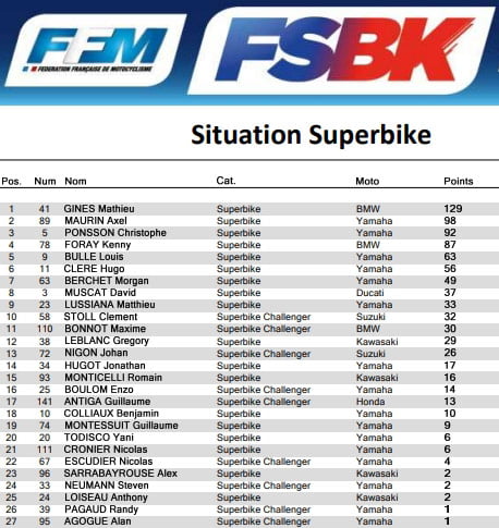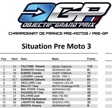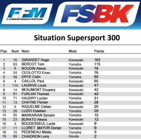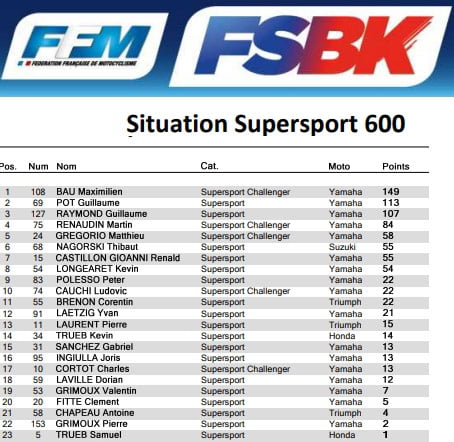 Au terme de la 3ème manche, Maximilien BAU (Yamaha) confirme qu’il est, pour le moment, le plus rapide cette saison. Le pilote Challenger cumule cinq victoires de rang et va tenter de poursuivre sa remarquable performance. Le pilote de la Yamaha n°108 compte plus de 35 points d’avance sur  (Yamaha), 2ème et  (Yamaha) 3ème. Ces deux derniers favoris comptent bien faire la jonction avec l’homme de tête…la bataille entre les trois pilotes s’annonce une nouvelle fois acharnée.