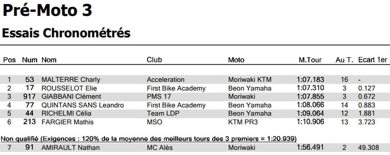 Aux 4ème et 5ème positions le paddock retrouve Leandro QUINTANS SANS (Beon Yamaha) en 1’08’’066 et Célia RICHELMI (Béon Yamaha) en 1’09’’064.