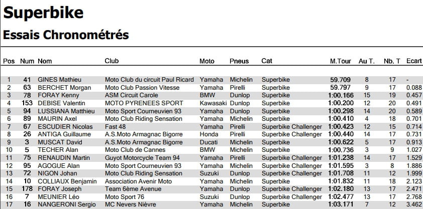 Déterminé à conserver son titre, le Champion Mathieu GINES (Yamaha Tech Solutions – Michelin) décroche le nouveau record de la piste en Championnat de France Superbike : 59’’709. Le pilote de la BMW n°41 s’élancera donc de la pole position devant Morgan BERCHET (Yamaha – Pirelli) également descendu sous la minute avec un meilleur tour en 59’’797. Kenny FORAY (BMW – Dunlop) s’octroie la 3ème place sur la grille de départ en 1’00’’166. À noter les belles performances de Valentin DEBISE (Kawasaki Twist Ring Racing – Dunlop) 4ème en 1’00’’200 et Matthieu LUSSIANA (Yamaha – Dunlop) 5ème en 1’’00’’298.