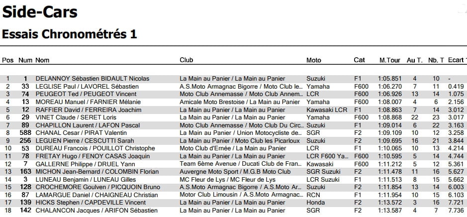 Après 7 tours, alors que PEUGEOT / PEUGEOT est distancé, le multiple Champion de France DELANNOY / BIDAULT prend le meilleur sur le F600 de LEGLISE / LAVOREL et reprend les commandes de la course. Puis, le side n°1 creuse rapidement l’écart sur les deux F600 de LEGLISE / LAVOREL et PEUGEOT / PEUGEOT. Dans le même temps, VINET / SIRET est isolé en 4ème position alors que CHAPILLON / LAFON et CHANAL / PIRAT sont en lutte pour le gain de 5ème place.