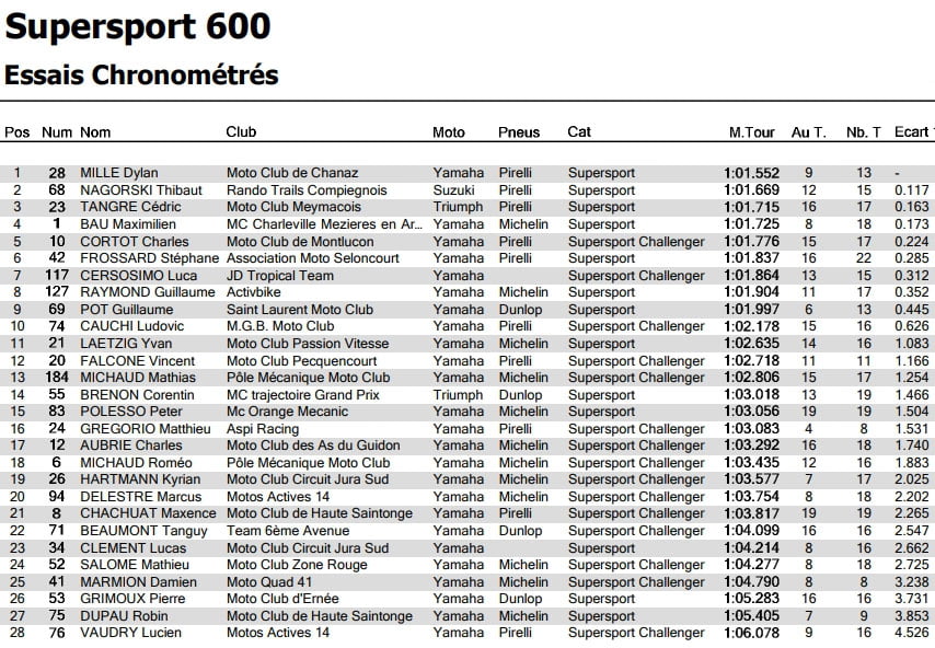 Du côté des pilotes Challengers, le plus rapide est donc Charles CORTOT, il devance Luca CERSOSIMO (Yamaha – Pirelli) 7ème du scratch en 1’01’’864. Pour compléter le top 3 de la catégorie, Ludovic CAUCHI (Yamaha – Pirelli) couvre un tour en 1’02’’178.