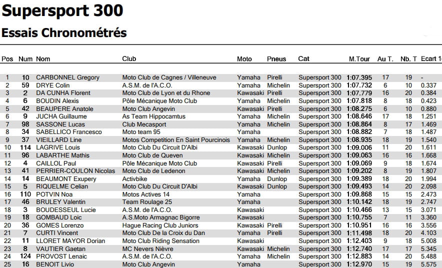 Déjà très rapide lors des essais libres, Grégory CARBONNEL (Yamaha – Pirelli) confirme ses bonnes sensations et signe le meilleur temps des qualifications en 1’07’’359. À la 2ème place, Colin DRYE (Yamaha – Michelin) couvre son tour le plus rapide en 1’07’’732. En fin de séance, Florent DA CUNHA (Kawasaki – Pirelli) grappille de précieux dixièmes qui lui permettent d’intégrer la première ligne en 1’07’’779.