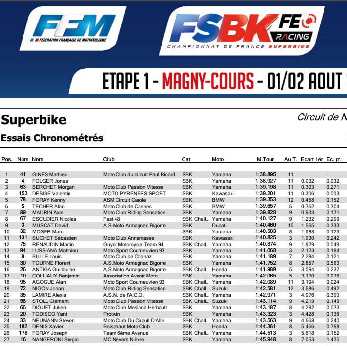 Au sein de la catégorie reine, Mathieu GINES (Yamaha Tech Solutions – Michelin), Champion de France 2019 conclut la séance en rappelant qu’il compte bien défendre son titre et signe la pole position en 1’38’’895 dans les toutes dernières minutes.
