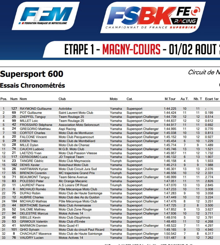 Le paddock observe Guillaume RAYMOND (Yamaha – Michelin) décrocher la pole position en 1’44’’225 devant Guillaume POT (Yamaha – Dunlop) en 1’44’’424. Le duo de Guillaume a bataillé les premières lignes de la feuille de temps avec les pilotes Supersport Challenger Tanguy ZAEPFEL (Yamaha – Michelin) et Loïc MILLET (Yamaha), auteurs des 3ème et 4ème temps en 1’44’’739 et 1’44’’837.