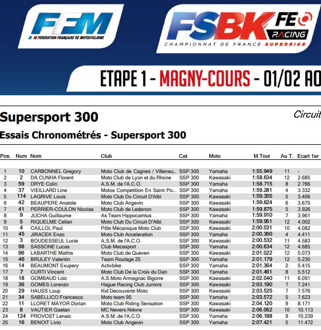 En Supersport 300, c’est Florent DA CUNHA (Kawasaki – Pirelli) qui décroche la 2ème place de la catégorie en 1’58’’634 devant Colin DRYE (Yamaha – Michelin) en 1’58’’715.