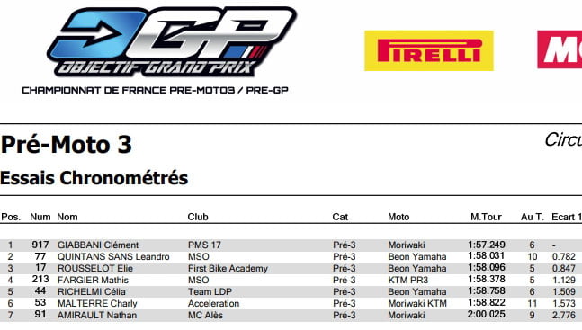 Premiers à s’élancer en piste l’après-midi, les concurrents du Supersport 300 et ceux de l’Objectif Grand Prix enchaînent les tours pour tenter de s’octroyer la pole position. Efficace dès ses premières sorties, Grégory CARBONNEL (Yamaha – Pirelli) est le seul à passer sous la barre des 1’56 et termine la séance en leader en 1’55’’949. À sa poursuite, on retrouve deux pilotes OGP dans le top 3 : Clément GIABBANI (Moriwaki) en 1’57’’249 et Leandro QUINTANS SANS (Beon Yamaha) en 1’58’’031.