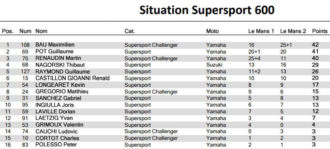 Début de saison en trombe pour la catégorie Supersport 600 ! Au sein du top 3, les pilotes Challenger Maximilien BAU (Yamaha) et Martin RENAUDIN (Yamaha) encadrent un Guillaume POT (Yamaha) à la 2ème place du provisoire. Les 3 adversaires débutent la saison séparés d’un point chacun, ils auront à cœur de régler leur compte sur le circuit de Nogaro.