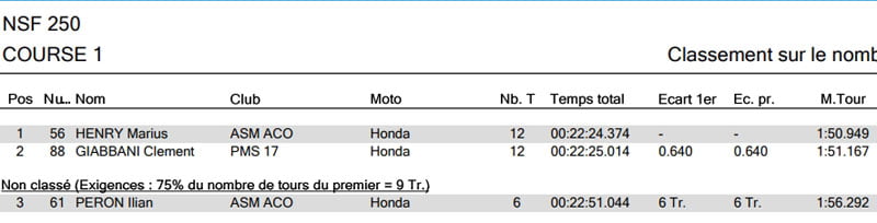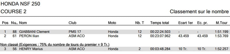 Clément GIABBANI termine second. Le 3ème pilote de la catégorie Ilan PERON (Honda) ne termine pas la course.