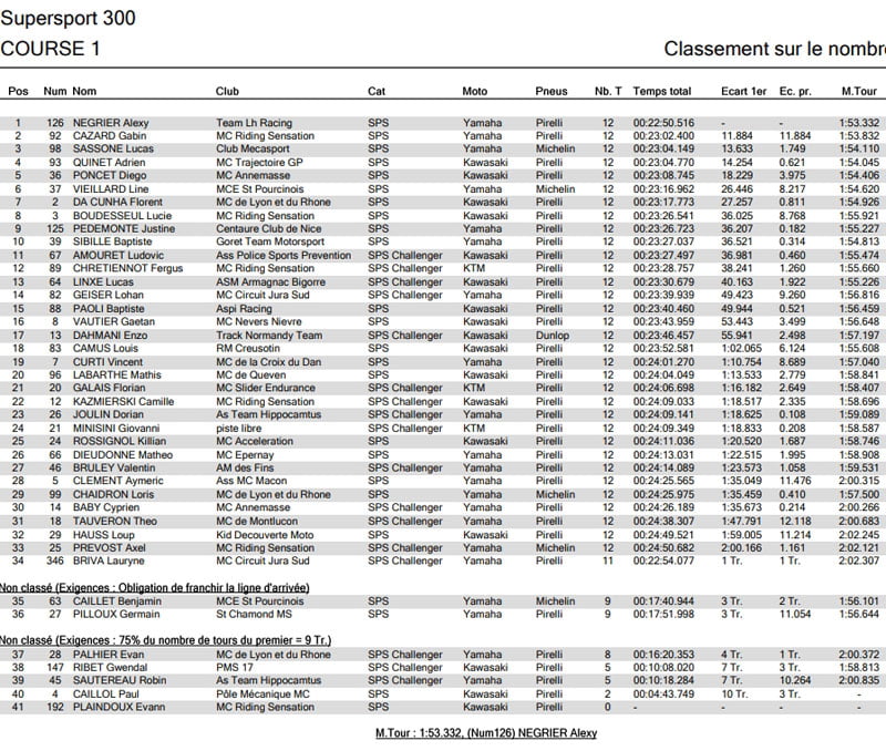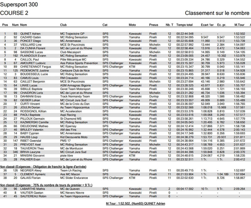 La hiérarchie ne changera pas sur la ligne d’arrivée pour le top 2. Derrière le pilote de la Kawasaki n°153, GINES démontre sa rigueur et conforte la deuxième place devant TECHER. En revanche, on retrouve LEBLANC qui termine au pied du podium après avoir pris le meilleur sur MAURIN dans les derniers instants de course. Moins rapide en deuxième partie de course, FORAY redescend dans le classement jusqu’au 11ème rang.