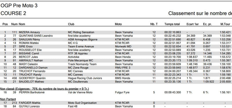Toujours aussi rapide que la veille, Amaury MIZERA (Beon Yamaha) réalise un très bon début de course qui lui permet de pointer en tête et de creuser un écart confortable sur le reste des concurrents du plateau. Sans surprise durant la fin de course, il s’impose avec près de 30 secondes d’avance sur son premier concurrent en Pré-Moto3 Leandro QUINTANS SANS (Beon Yamaha)