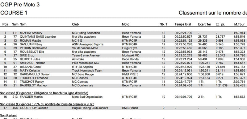Leandro QUINTANS SANS (Beon Yamaha), quant à lui, termine 2ème. C’est pour la 3ème place de la catégorie que la bataille fait rage. Rémy SANJUAN (KTM RC4R) tire son épingle du jeu et complète le podium laissant Mathéo ROMAN (KTM RC4R) et Enzo SIRE (Moriwaki) à la 4ème et 5ème place des OGP.