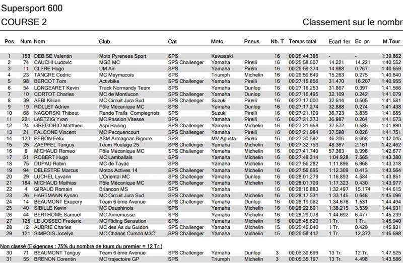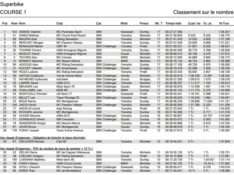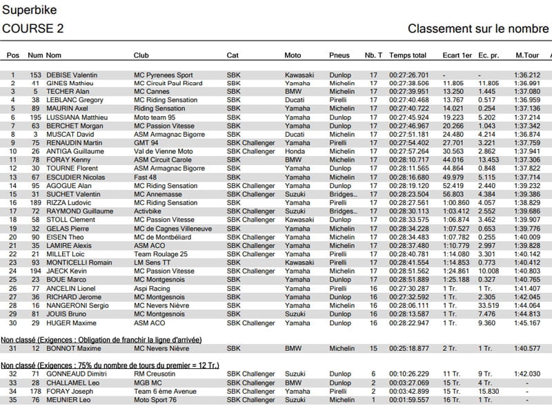 Les écarts se creusent entre DEBISE, GINES et MAURIN durant la 2ème partie de course. Après avoir fait cavalier seul durant les 17 tours, DEBISE s’impose avec près de 10 secondes d’avance. Une première large victoire au Championnat ! GINES confirme sa 2ème place devant MAURIN. Au pied du podium, Morgan BERCHET (Yamaha – Dunlop) signe un très beau retour au sein du Championnat de France Superbike.