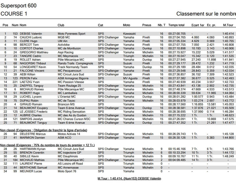 On observe également la belle performance du pilote Challenger Matthieu GREGORIO (Yamaha – Michelin) qui se classe 6ème devant le 3ème pilote Supersport de la course : Cédric TANGRE (Triumph – Michelin).