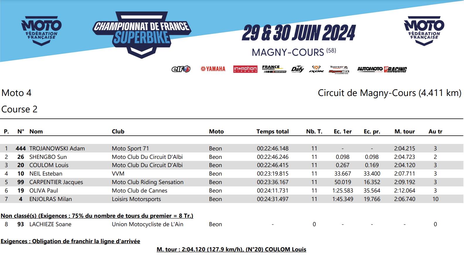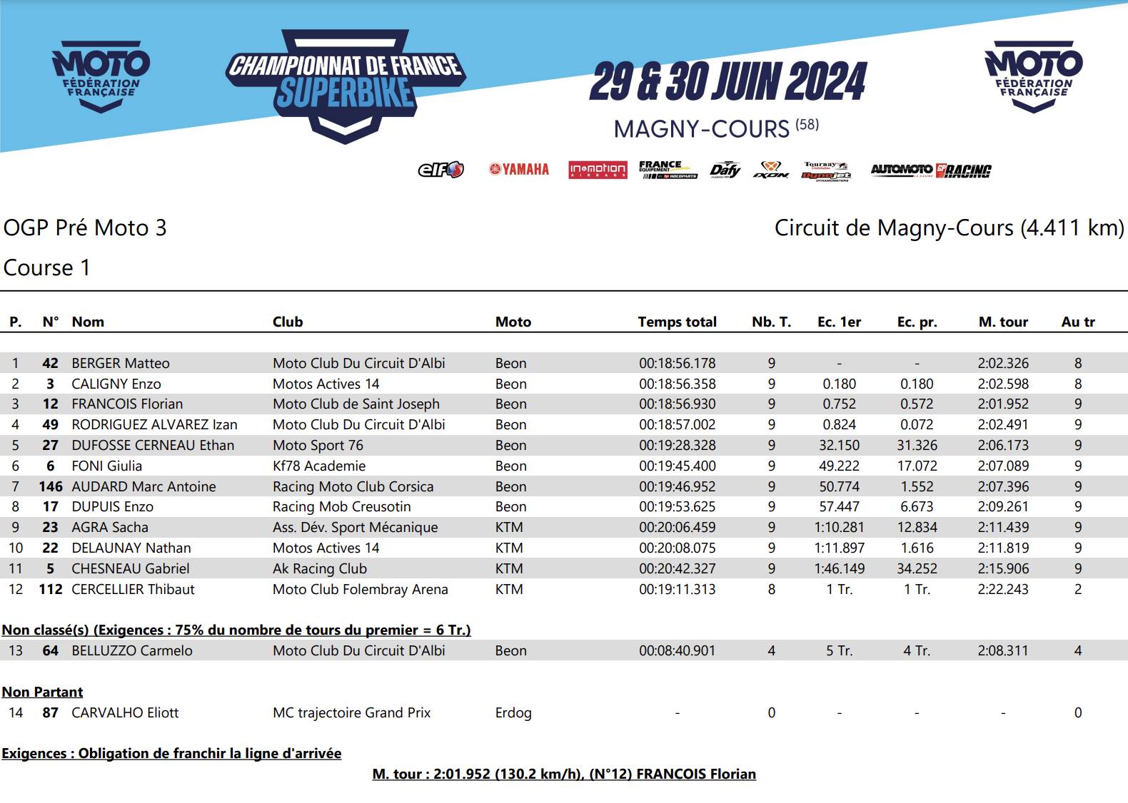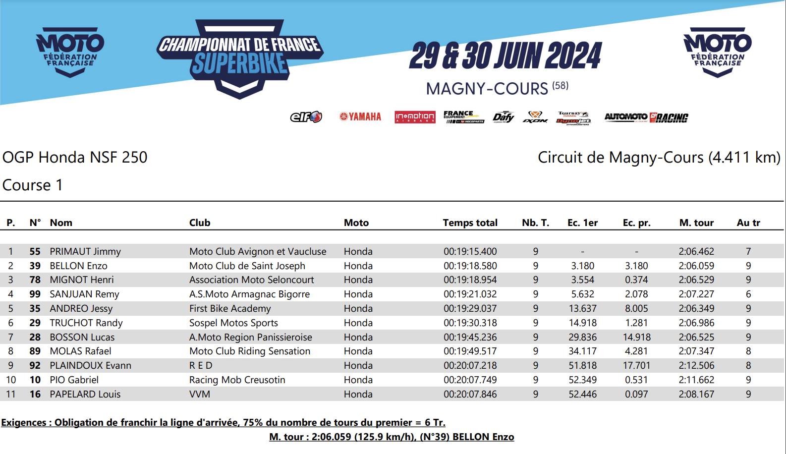 Au drapeau à damier et après une course aboutie du début à la fin, Jimmy PRIMAUT remporte sa 2ème victoire de la saison. Enzo BELLON et Henri MIGNOT terminent respectivement aux 2ème et 3ème places après avoir pris le meilleur sur Rémy SANJUAN, finalement 4ème, et Jessy ANDREO (Honda – Pirelli), 5ème. Randy TRUCHOT conclut à la 6ème place.