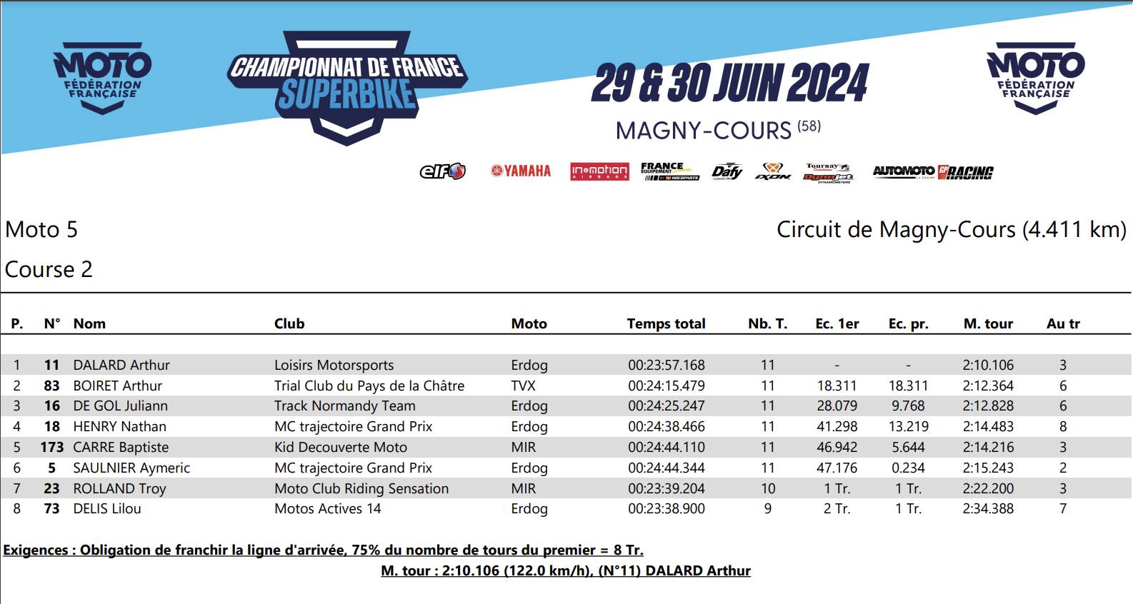 Pas de surprise à l’arrivée. Arthur DALARD réalise une course parfaite et s’impose logiquement à Magny-Cours. Il devance Arthur BOIRET, second, qui a su contenir les ardeurs de Juliann DE GOL, qui monte sur la 3ème marche du podium.