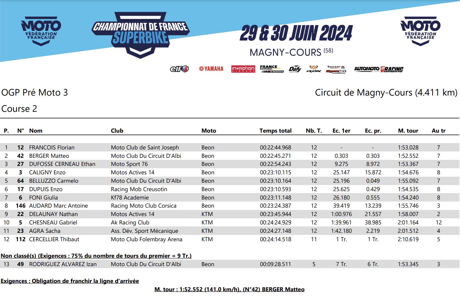 Coup de théâtre, le leader ALVAREZ RODRIGUEZ, chute à la mi-course et laisse les commandes à FRANÇOIS, challengé par BERGER, désormais second. Finalement c’est bien la BEON #12 de Florian FRANÇOIS qui passe la ligne d’arrivée en tête devant la machine Matteo BERGER, 2ème. Ethan DUFOSSE CERNEAU monte sur la 3ème marche de la boite. Enzo CALIGNY termine 4ème et Carmelo BELLUZO (BEON – Pirelli) entre dans le top 5.