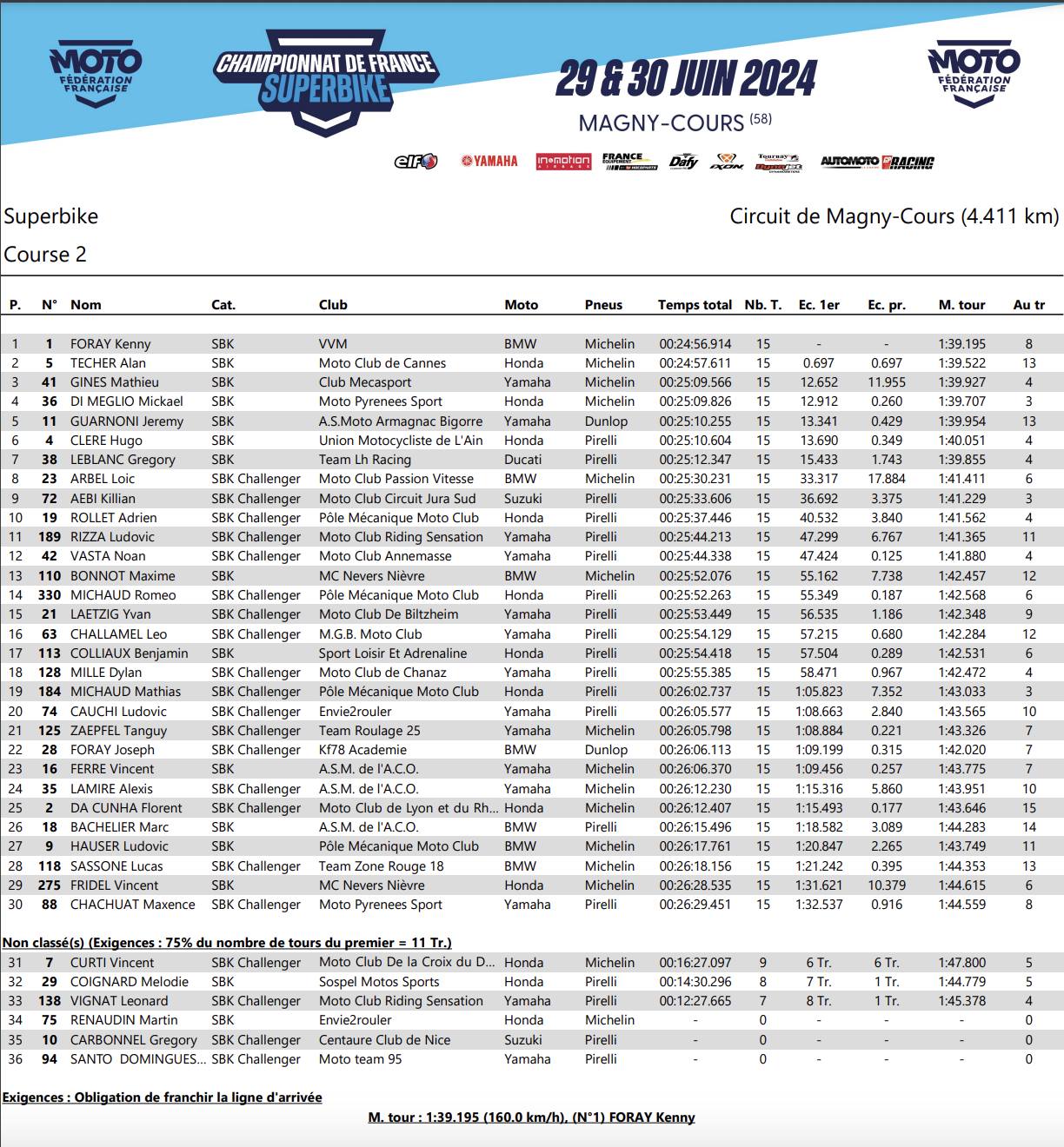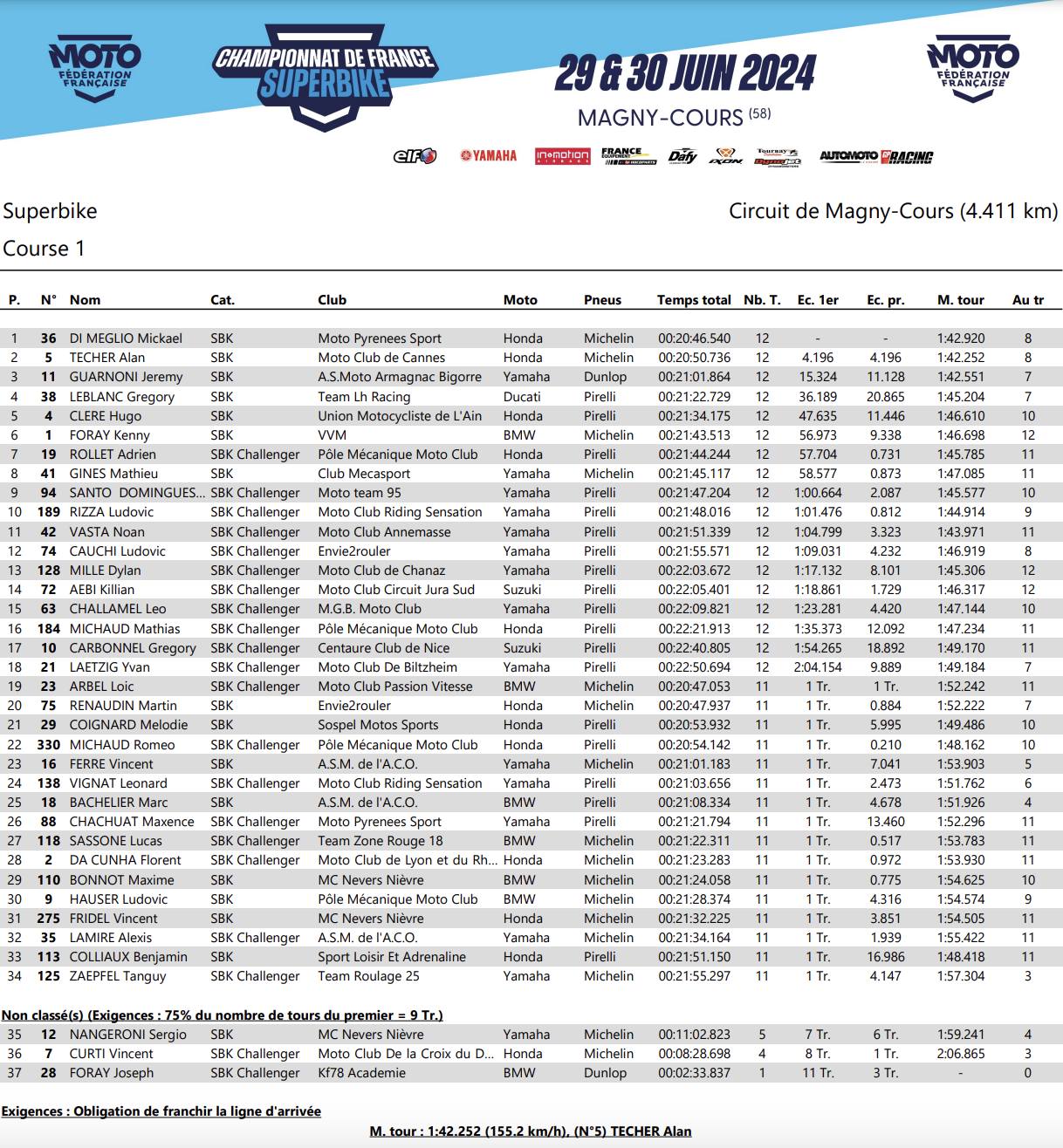 Au drapeau à damier, Mike DI MEGLIO s’impose en patron et est bel et bien de retour aux affaires. Il engrange de gros points tout comme Alan TECHER, second, et Jérémy GUARNONI, 3ème. Le top 5 est complété par Grégory LEBLANC, 4ème et Hugo CLERE, 5ème. Avec ses pneus pluie, Kenny FORAY parvient à sauver les meubles avec une 6ème place, conservée de justesse face aux attaques du 1er Challenger Adrien ROLLET, finalement 7ème devant Mathieu GINES, 8ème.