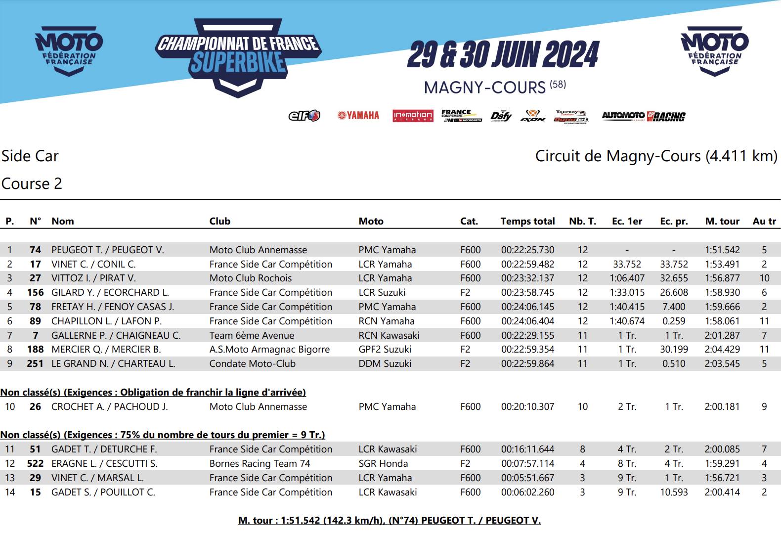 Pour son deuxième départ du week-end, PEUGEOT / PEUGEOT (F600) ne déroge pas à la règle. L’envol est bon et permet au side #74 de conserver les commandes de la course. Après 2 tours l’écart est déjà au-delà des 2 secondes avec VINET / CONIL (F600), second. Bien plus loin, nous retrouvons VITTOZ / PIRAT (F600), 3ème.