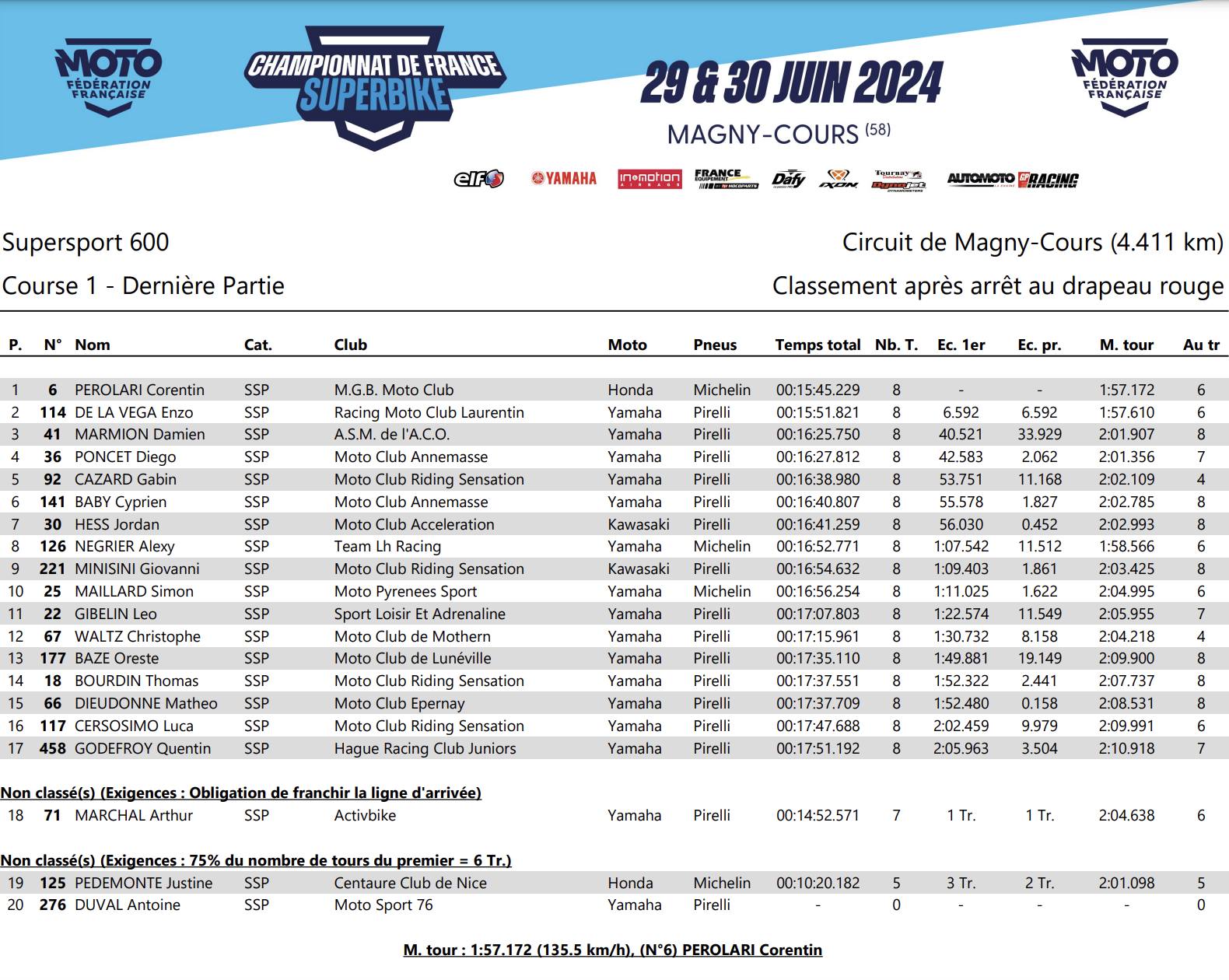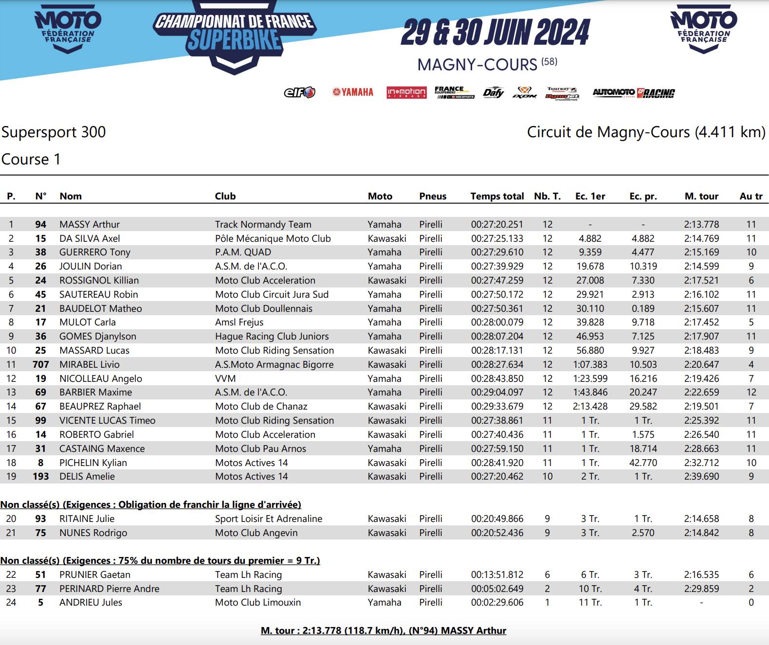 Au passage de la ligne et après de nombreux rebondissements dans les derniers tours de course, PEROLARI, s’impose logiquement. Il devance largement Enzo DE LA VEGA qui empoche tout de même les 20 points de la seconde place. La 3ème marche du podium est pour Damien MARMION qui monte pour la première fois sur la boite. Diego PONCET et Gabin CAZARD profitent des chutes de Justine PEDEMONTE et Alexy NEGRIER pour s’emparer des 4ème et 5ème places. À noter, la belle prestation du jeune Cyprien BABY (Yamaha – Pirelli) qui termine 6ème.