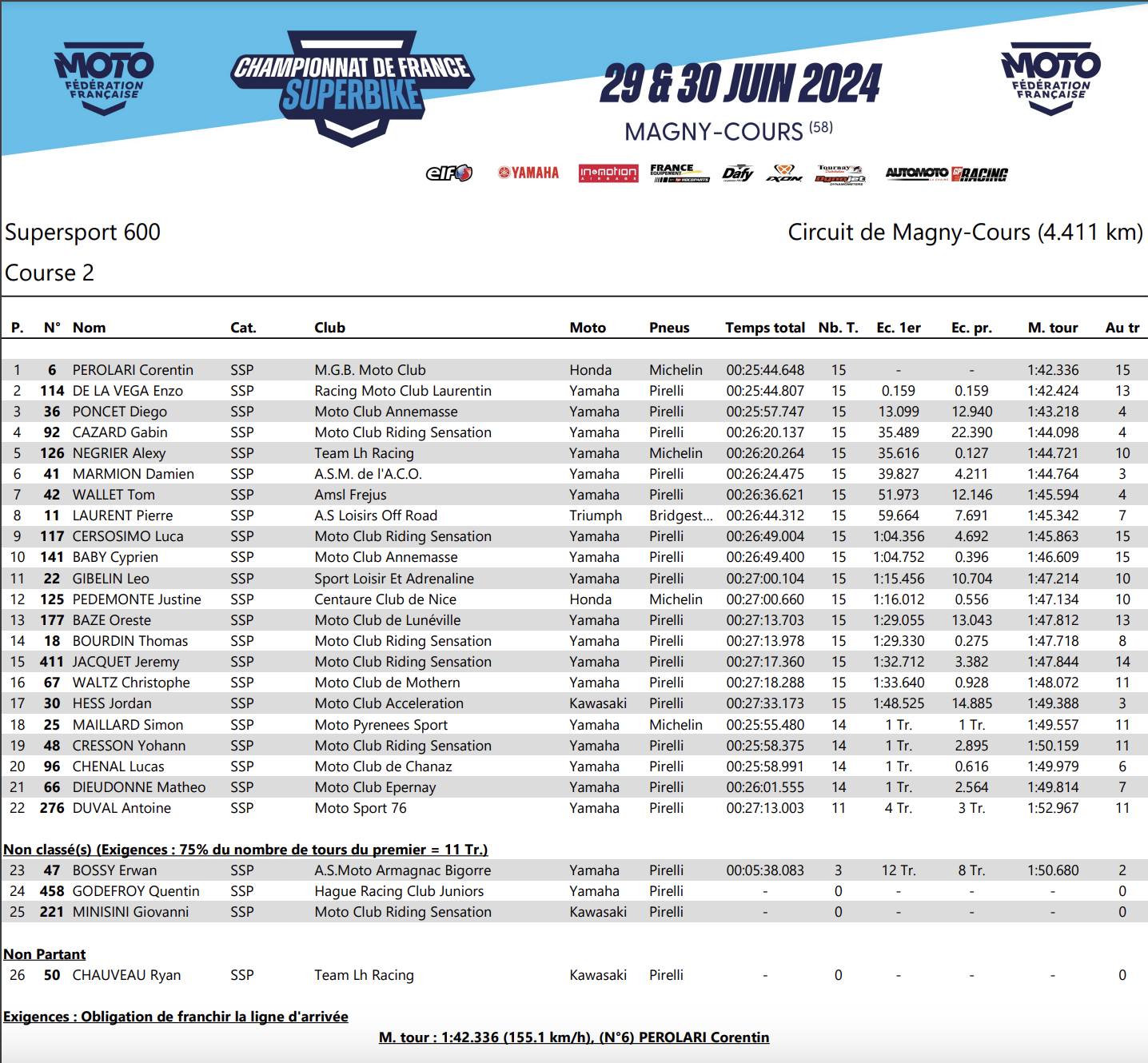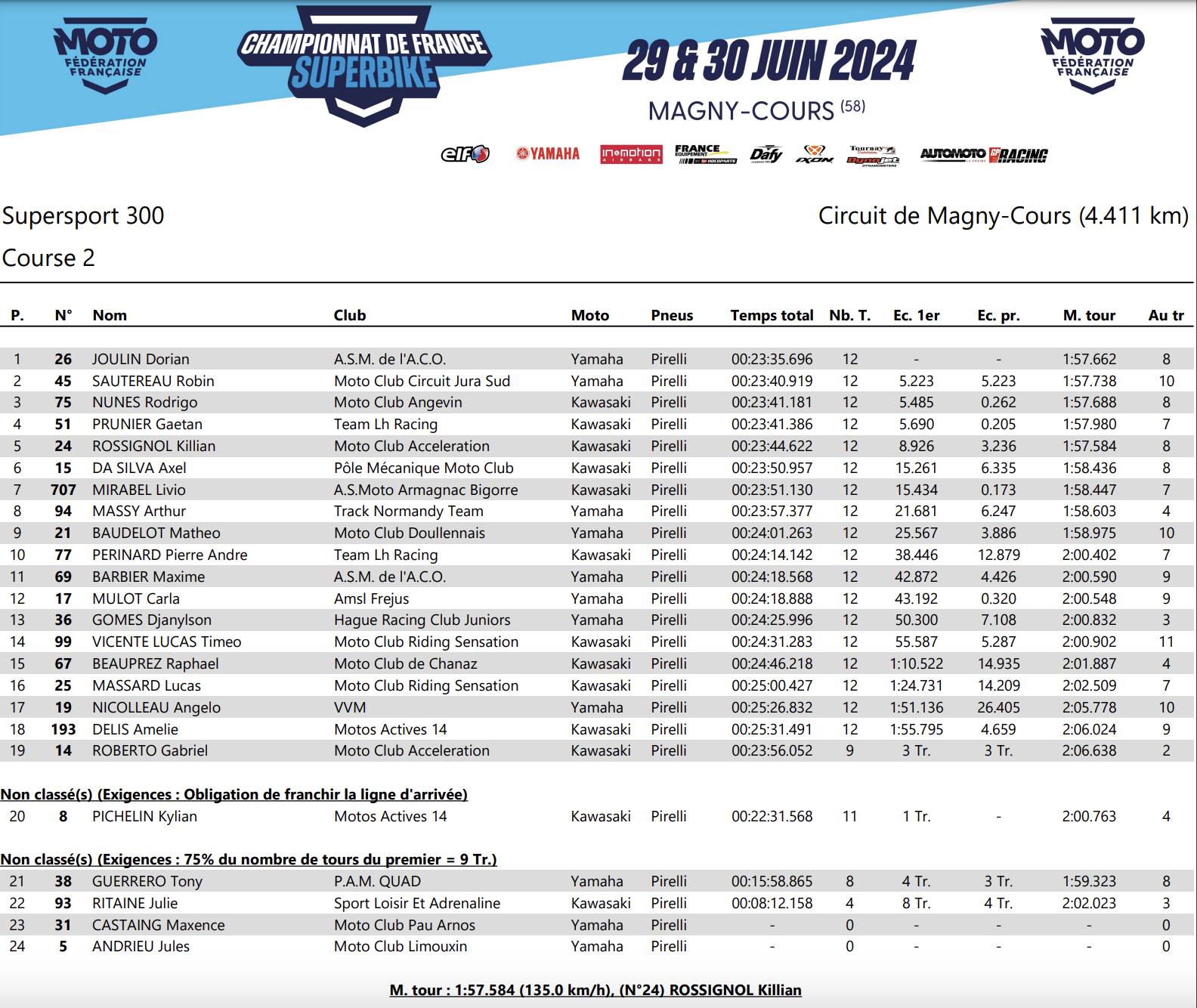 Enzo DE LA VEGA (Yamaha – Pirelli) parvient cette fois à conserver les commandes de la course au départ. Le pilote de la Yamaha #114 mène la danse avec dans sa roue Corentin PEROLARI (Honda – Michelin). Légèrement plus loin, Diego PONCET (Yamaha – Pirelli) est 3ème et devance Gabin CAZARD (Yamaha – Pirelli), malheureux en course 1, 4ème. Le top 5 est complété par Alexy NEGRIER (Yamaha – Michelin), qui fait preuve de prudence après sa chute du matin. Damien MARMION (Yamaha – Pirelli) est quant à lui 6ème.