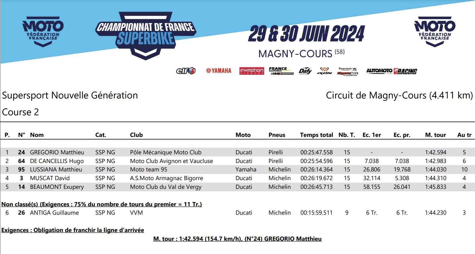 Course aboutie pour l’expérimenté David MUSCAT qui s’impose pour la 3ème fois de la saison ! Il devance très largement son poursuivant Matthieu LUSSIANA (Yamaha – Michelin), second, et Matthieu GREGORIO empoche une belle 3ème place. Exupéry BEAUMONT et Guillaume ANTIGA finissent respectivement 4ème et 5ème.