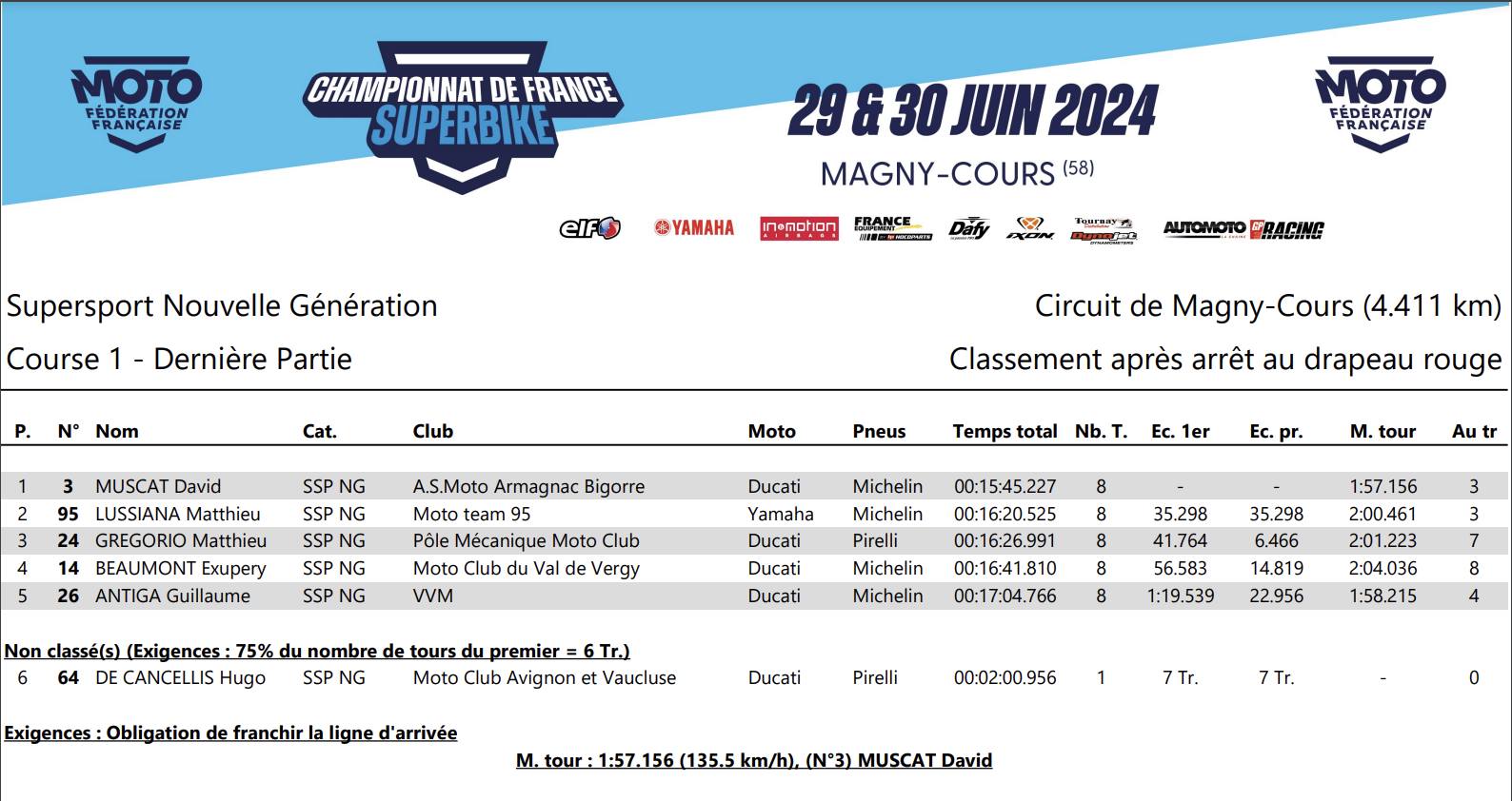 À la reprise, on retrouve David MUSCAT en leader devant Matthieu LUSSIANA, second et Matthieu GREGORIO, 3ème. Hugo DE CANCELLIS, alors 4ème, part à la faute et abandonne. Exupéry BEAUMONT (Ducati – Michelin) gagne alors une position et passe 4ème devant Guillaume ANTIGA qui complète le top 5.