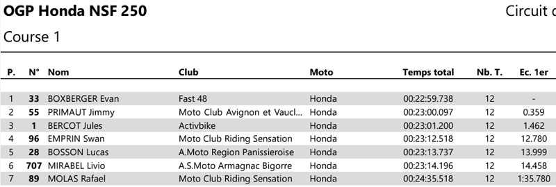 Le reste du peloton est dispersé sur la piste et les positions restent inchangées jusqu’à la fin. Après avoir bataillé de bout en bout, c’est finalement Matteo BERGER qui prend le meilleur sur son adversaire du jour Gabriel PIO, second. Kevin MAIFFRET (Corse – Bridgestone) s’empare de la 3ème place du podium devant Florian FRANÇOIS, 4ème.