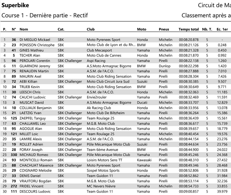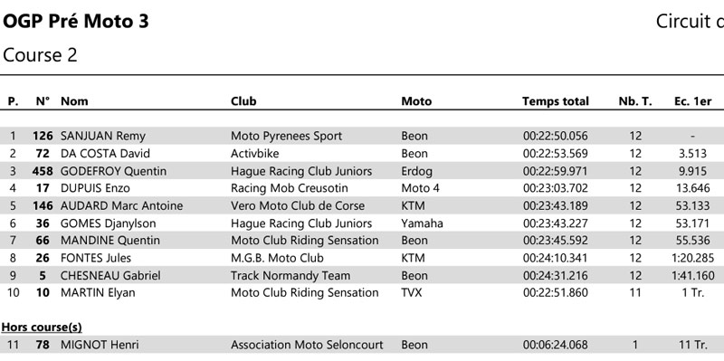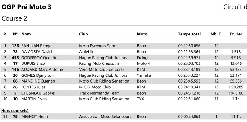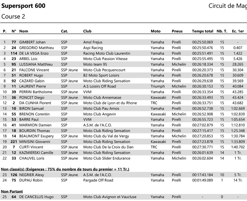 Au passage de la ligne, Johan GIMBERT remporte sa 3ème course de la saison. Il devance Matthieu GREGORIO, second qui repart avec le point du meilleur tour en course et Enzo DE LA VEGA, 3ème. Ces derniers montent pour la deuxième fois du week-end sur le podium. Au pied de la boîte, Loïc ARBEL n’a pas su se maintenir aux places d’excellence mais empoche tout de même de gros points pour le championnat. Matthieu LUSSIANA s’empare une nouvelle fois de la 5ème place devant le premier de la catégorie challenger, Vincent FALCONE, 6ème, qui est parvenu à prendre le meilleur sur Hugo ROBERT qui termine 7ème. Gabin CAZARD (Yamaha – Pirelli), second du podium challenger termine une nouvelle fois 8ème au scratch devant Laurent Pierre (Triumph – Michelin), 9ème et le 3ème challenger Bartholomé PERRIN (Yamaha – Michelin), 10ème au scratch.