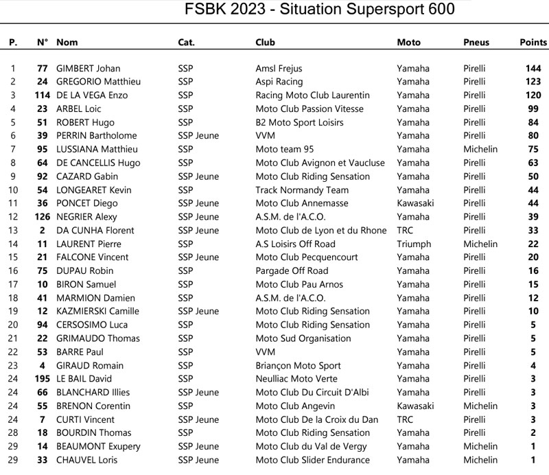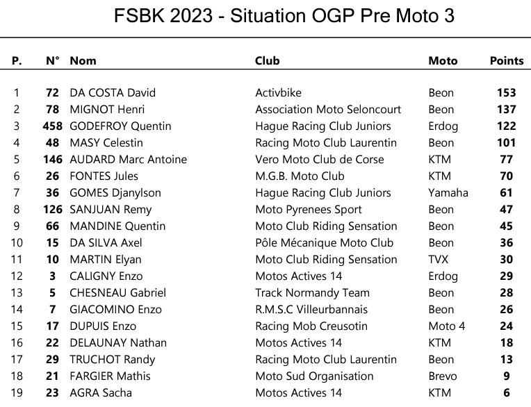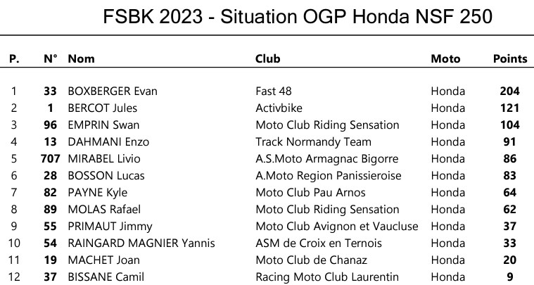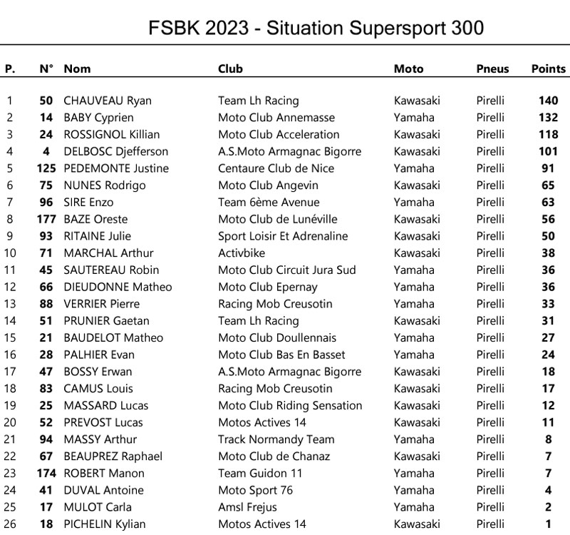 Pour le moment ce serait donc D’Jefferson DELBOSC (Kawasaki – Pirelli), actuel 3ème qui marquerait le plus de points pour le classement. Ce dernier est suivi par le talentueux Cyprien BABY (Yamaha – Pirelli), 4ème à la conquête d’un énième podium cette saison. Killian ROSSIGNOL (Kawasaki – Pirelli) referme le top 5. En 6ème position, Justine PEDEMONTE (Yamaha – Pirelli) garde un bon rythme et semble en mesure de recoller aux hommes de tête.
