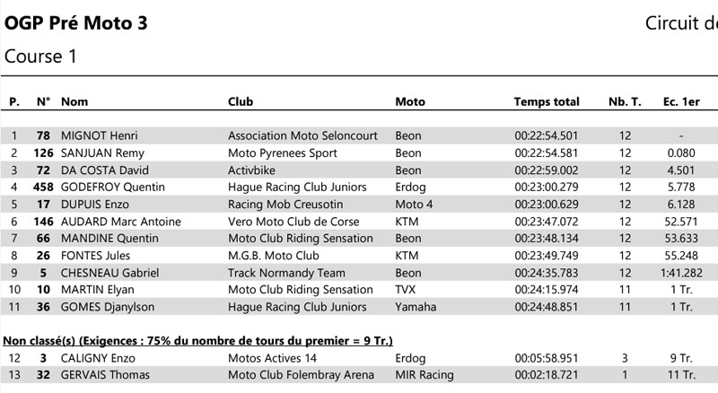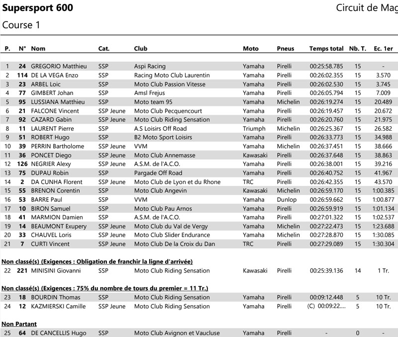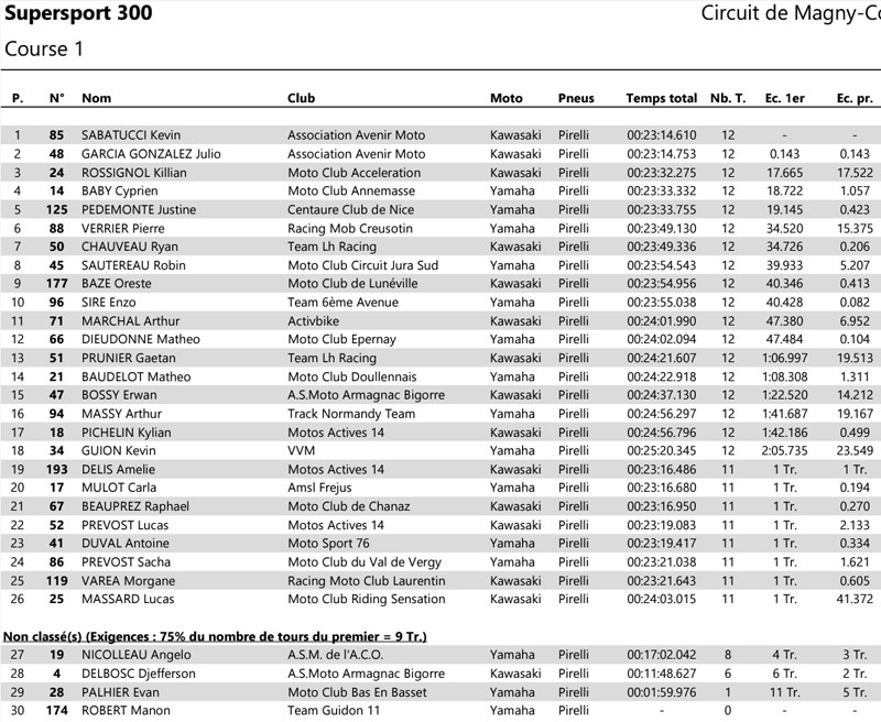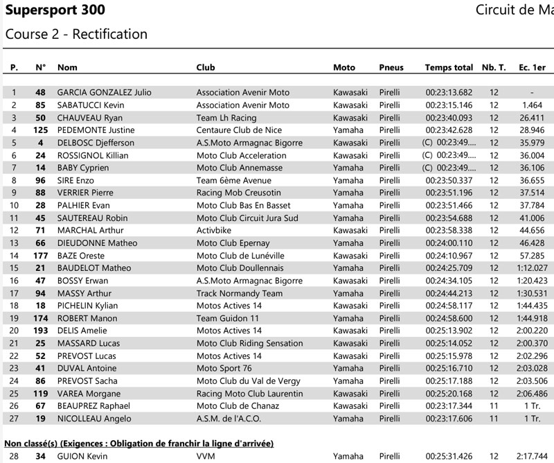 Les positions continuent de s’interchanger entre les deux hommes de tête jusqu’au passage de la ligne d’arrivée. C’est Kevin SABATUCCI qui a le dernier mot et qui s’impose ! Julio GARCIA GONZALEZ termine second et devance Killian ROSSIGNOL qui complète le podium. À la 4ème place, on retrouve Cyprien BABY (Yamaha – Pirelli) et Justine PEDEMONTE (Yamaha – Pirelli) complète le top 5. Pierre VERRIER (Yamaha – Pirelli) est 6ème et Ryan CHAUVEAU, termine 7ème.