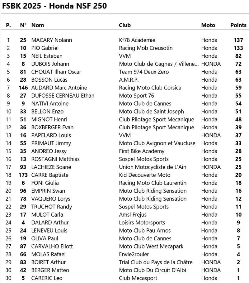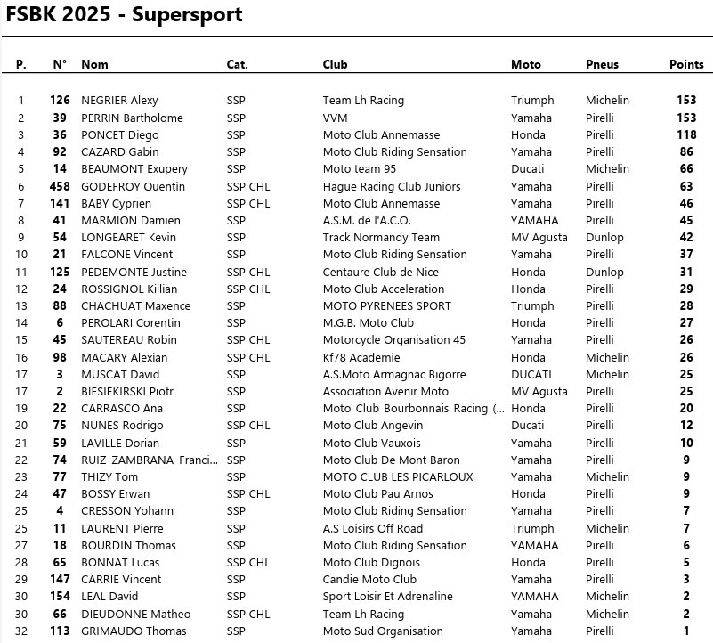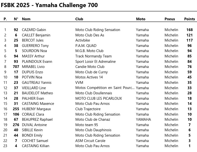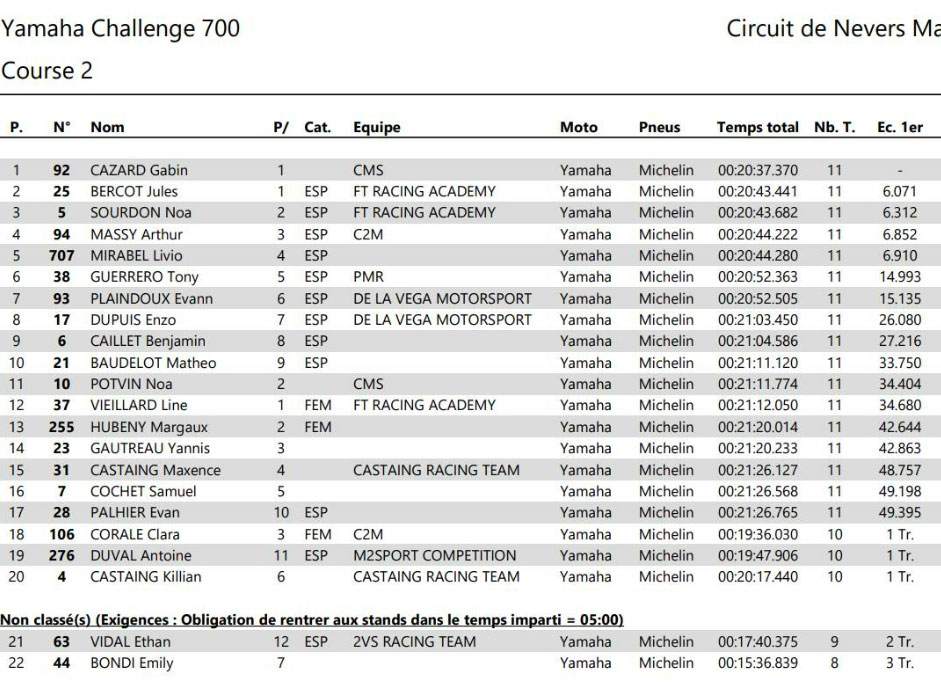 Un drapeau rouge dans le dernier tour met un terme prématuré à la course. CAZARD s’impose logiquement, devant BERCOT, solide 2e, et SOURDON qui complète le podium. MASSY termine 4e, devançant MIRABEL, 5e. GUERRERO signe une belle 6e place, tandis que PLAINDOUX boucle le top 7.