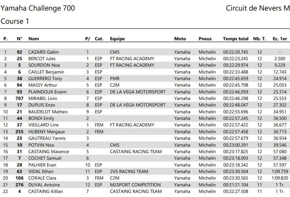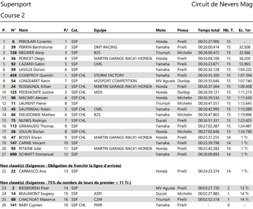 PEROLARI franchit la ligne d’arrivée en solitaire avec plus de 32 secondes d’avance, démonstration de force à l’appui. PERRIN parvient à conserver sa 2e place de justesse face à NEGRIER, 3e après une belle remontée. PONCET termine finalement 4e, juste devant Gabin CAZARD (Yamaha Team CMS – Michelin), 5e et Dorian LAVILLE (Yamaha – Pirelli), 6e.