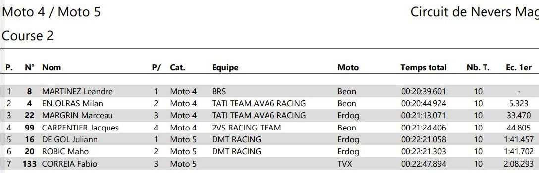 Dans la catégorie MOTO 5, Juliann DE GOL (Erdog DMT Racing – Pirelli) s’impose au terme d’une course serrée, résistant à la pression constante de Maho ROBIC (Erdog DMT Racing – Pirelli), 2e. Fabio CORREIA (TVX – Pirelli) complète ce podium, après une course solide.