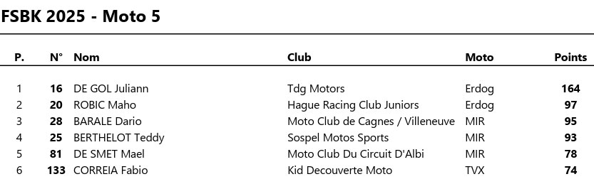 SITUATION AU CHAMPIONNAT MOTO 5 :
