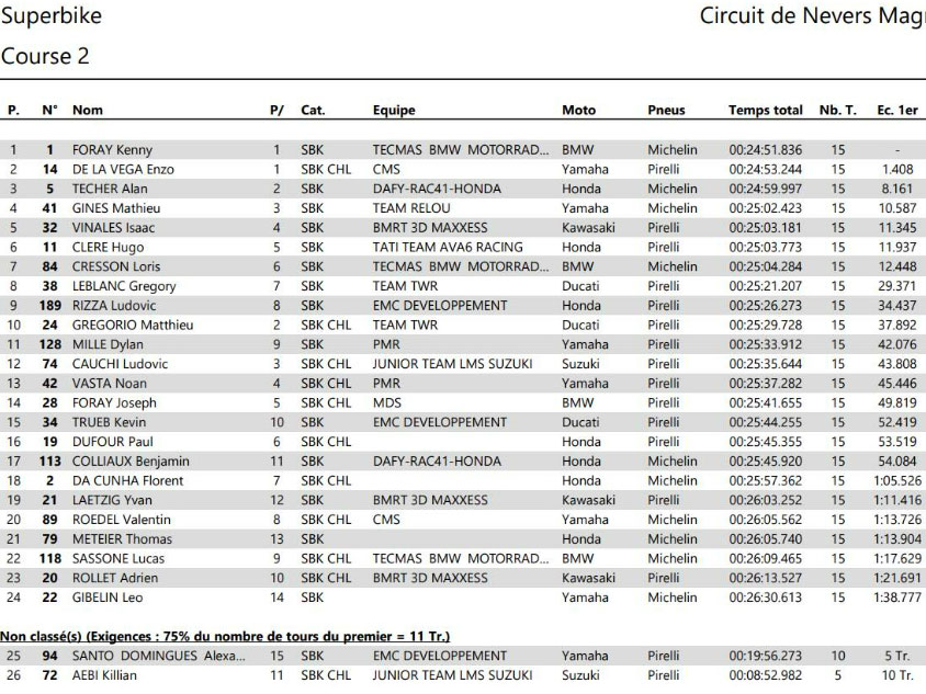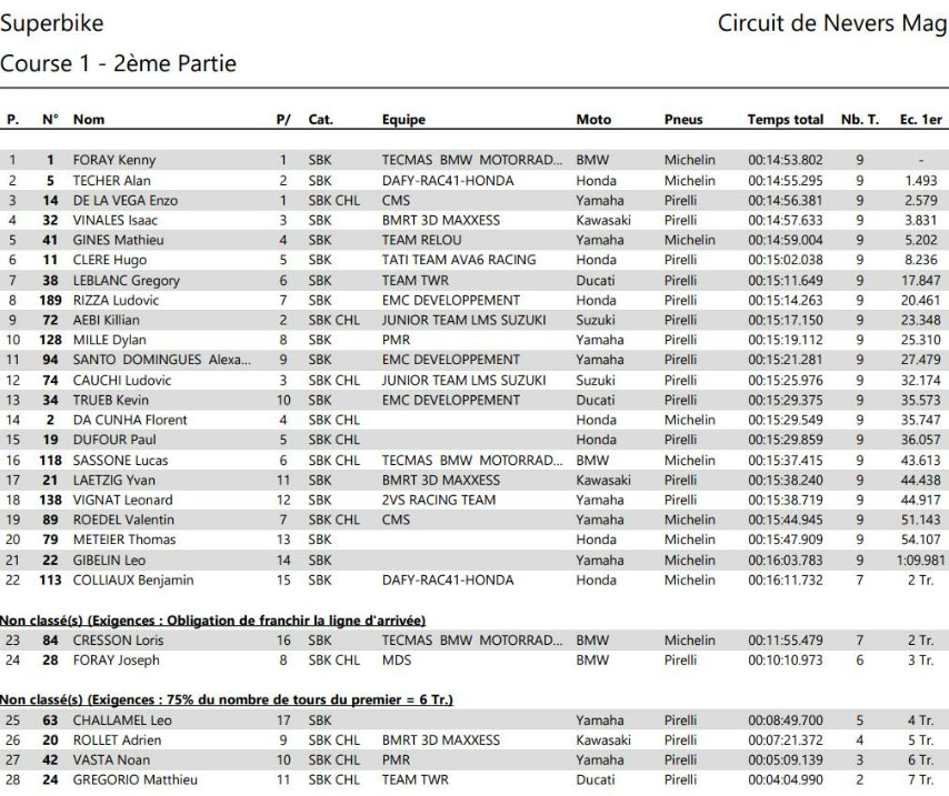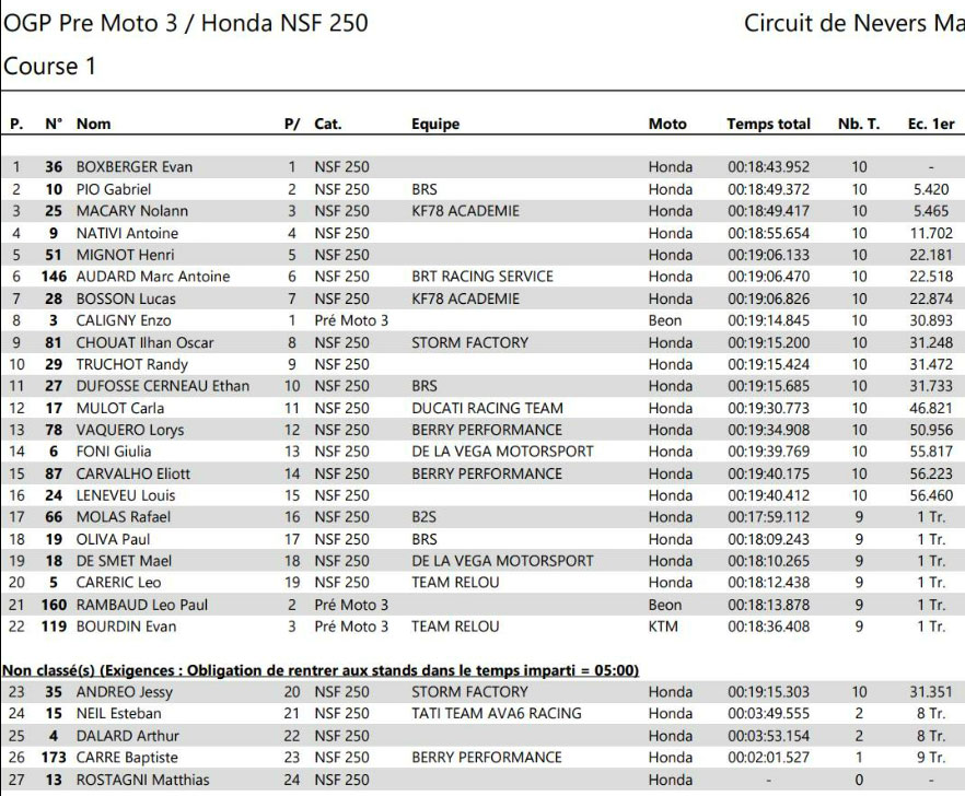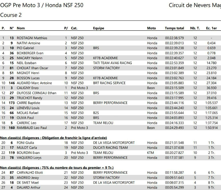 Au damier, FORAY l’emporte, résistant à la pression constante de TECHER, 2e. DE LA VEGA, auteur d’une course solide, complète le podium et s’impose une nouvelle fois chez les Challengers. VINALES, en wild card, s’adjuge une belle 4e place devant GINES, 5e, et CLERE, 6e. Gregory LEBLANC (Ducati Team TWR – Pirelli), en difficulté ce week-end, sauve les meubles avec une 7e place. Il devance Ludovic RIZZA (Honda Team EMC Développement – Michelin), 8e, et Killian AEBI (Junior Team LMS Suzuki – Pirelli), 9e au scratch et 2e Challenger. Dylan MILLE (Yamaha Team PMR – Pirelli) complète le top 10.